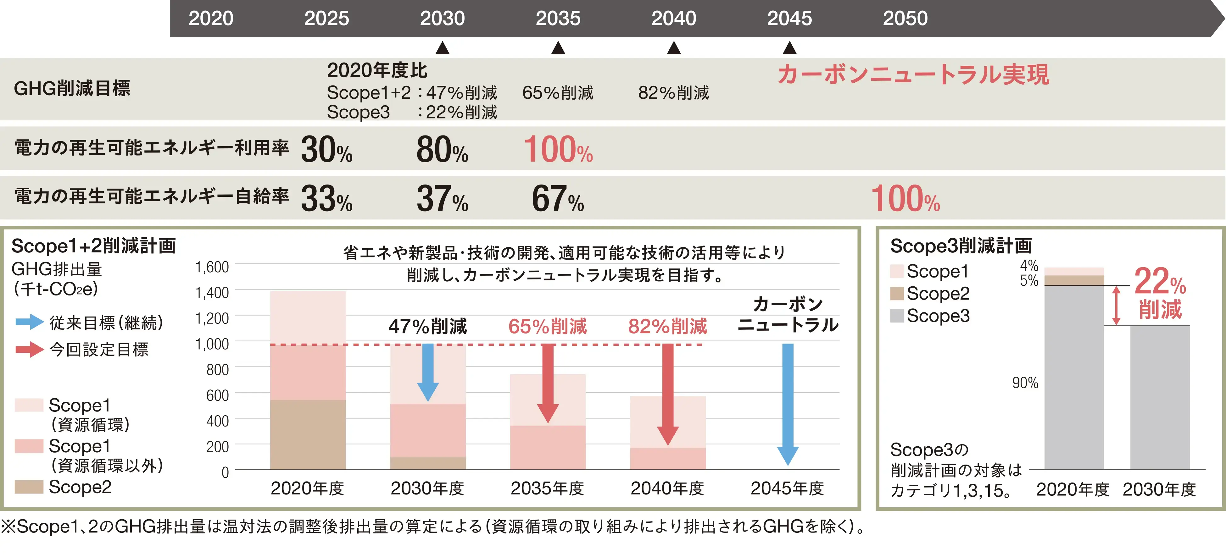 さらに、このたび従来の2030年度・2045年度目標に加え、2025年2月に日本政府が設定した「日本のNDC(国が決定する貢献)」も踏まえ、Scope1(資源循環の取り組みによる排出を除いたGHG排出量)の2035年度、2040年度の排出量の削減目標について、2030年度目標と2045年度目標を直線で結ぶ傾き上の数値を基に新たに設定しました。Scope2については、従来通り2035年度の再エネ利用率100%の目標を維持しました。当社がGHG排出削減目標の対象としているScope1(資源循環の取り組みによる排出を除いたGHG排出量)、Scope2について今回設定する目標は、2035年度65%削減、2040年度82%削減とします。