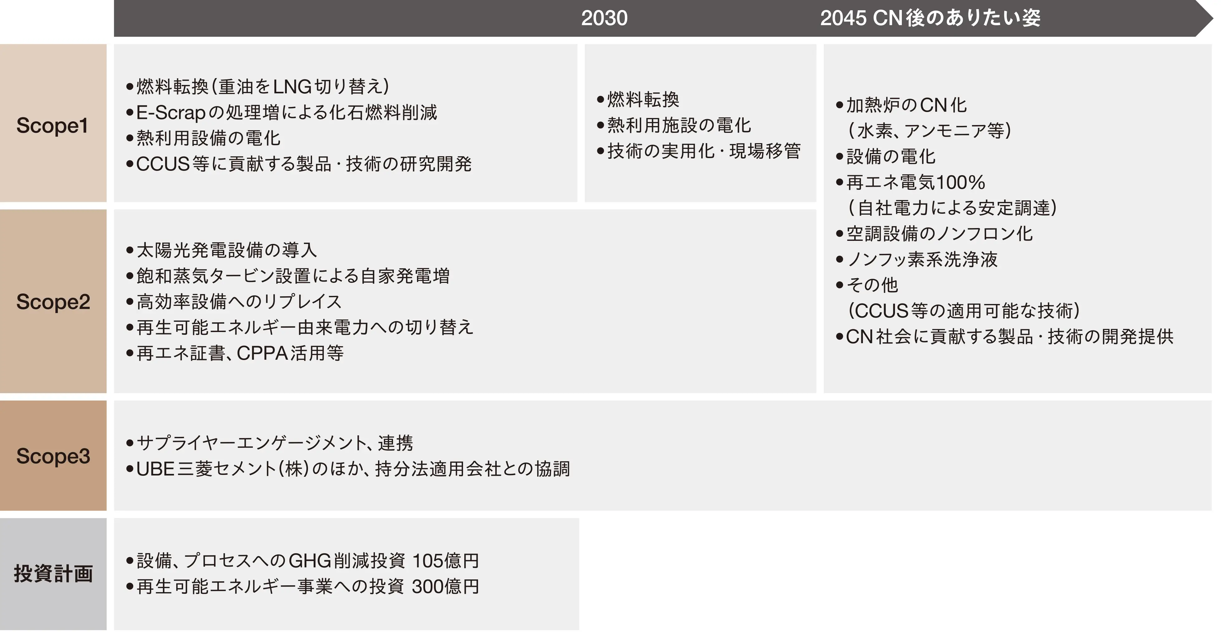 2030年度までのGHG排出量削減計画を策定し、設備や工程の高効率化等によるエネルギー使用量削減、プロセスの電化や燃料転換、再生可能エネルギー(再エネ)由来電力への切り替えを進める 2035年度までに当社グループの購入電力の100%を再エネ由来電力に切り替える 長期的にCN燃料の利用やCO2の回収・利活用などの革新的技術開発を加速する |