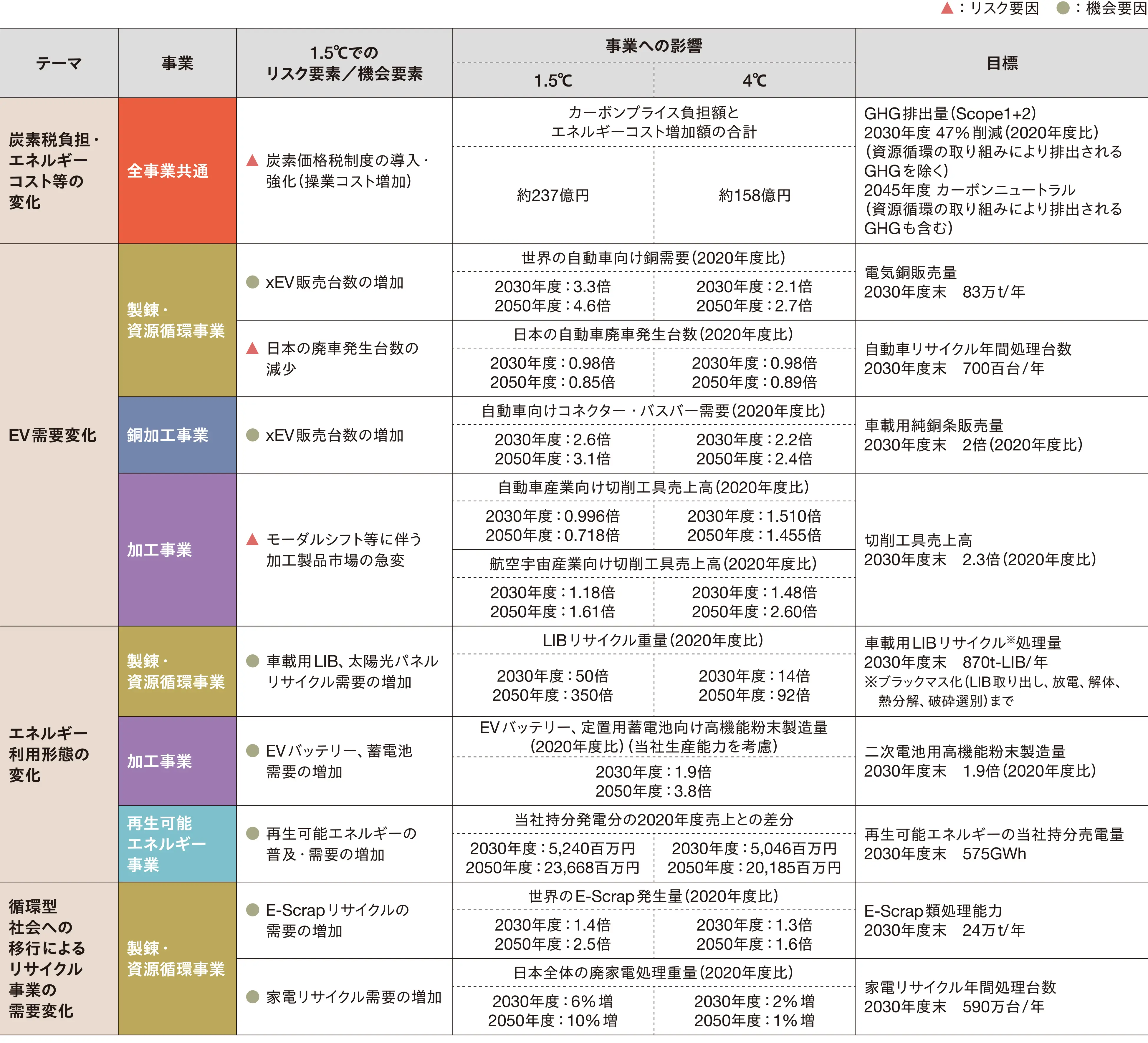移行リスクと機会については、2023年2月に中期経営戦略2030との整合性を取りながら、シナリオ分析の更新、事業の指標と目標を定めました。それぞれのテーマで1.5℃シナリオと4℃シナリオを設定し分析しました。全事業共有のリスクとして、気候変動に対する政策および法規制が強化され、炭素価格制度(カーボンプライシング)が導入、強化された場合の当社グループへの財務影響を試算しました。また、EV需要変化やエネルギー利用形態の変化、循環型社会への移行によるリサイクル事業の需要変化について、当社の事業への影響をリスクと機会の側面から分析しました。物理的リスクについても、気候変動に関連すると考えられる激甚化した豪雨・洪水や高潮・渇水等の急性および慢性リスクによる被害等の水リスクを含め、全社リスクマネジメント活動において管理しています。