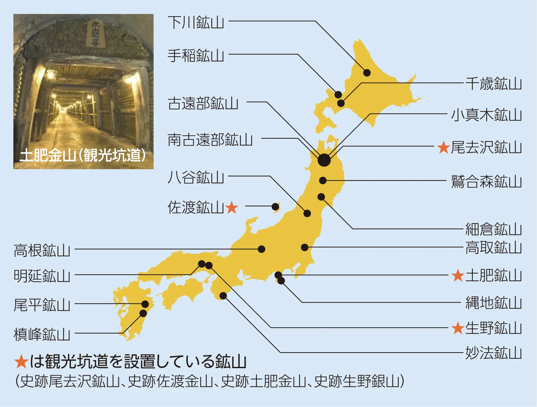 一部の休廃止鉱山では坑道の一部を保存・整備し、操業当時の様子や鉱山技術等を後世に伝える文化的遺産あるいは観光施設としても活用されています。