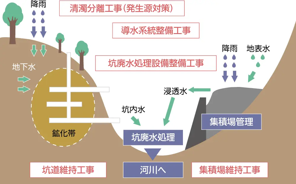 - 集積場(鉱石の採掘に伴い発生した岩石や鉱さい、坑廃水処理で発生した殿物の集積場所)の維持