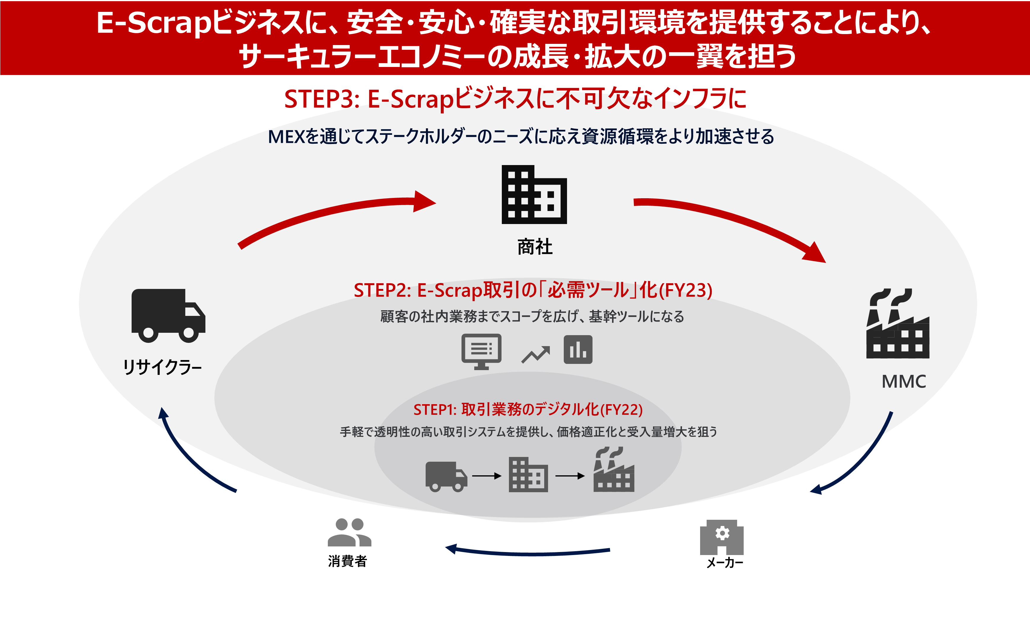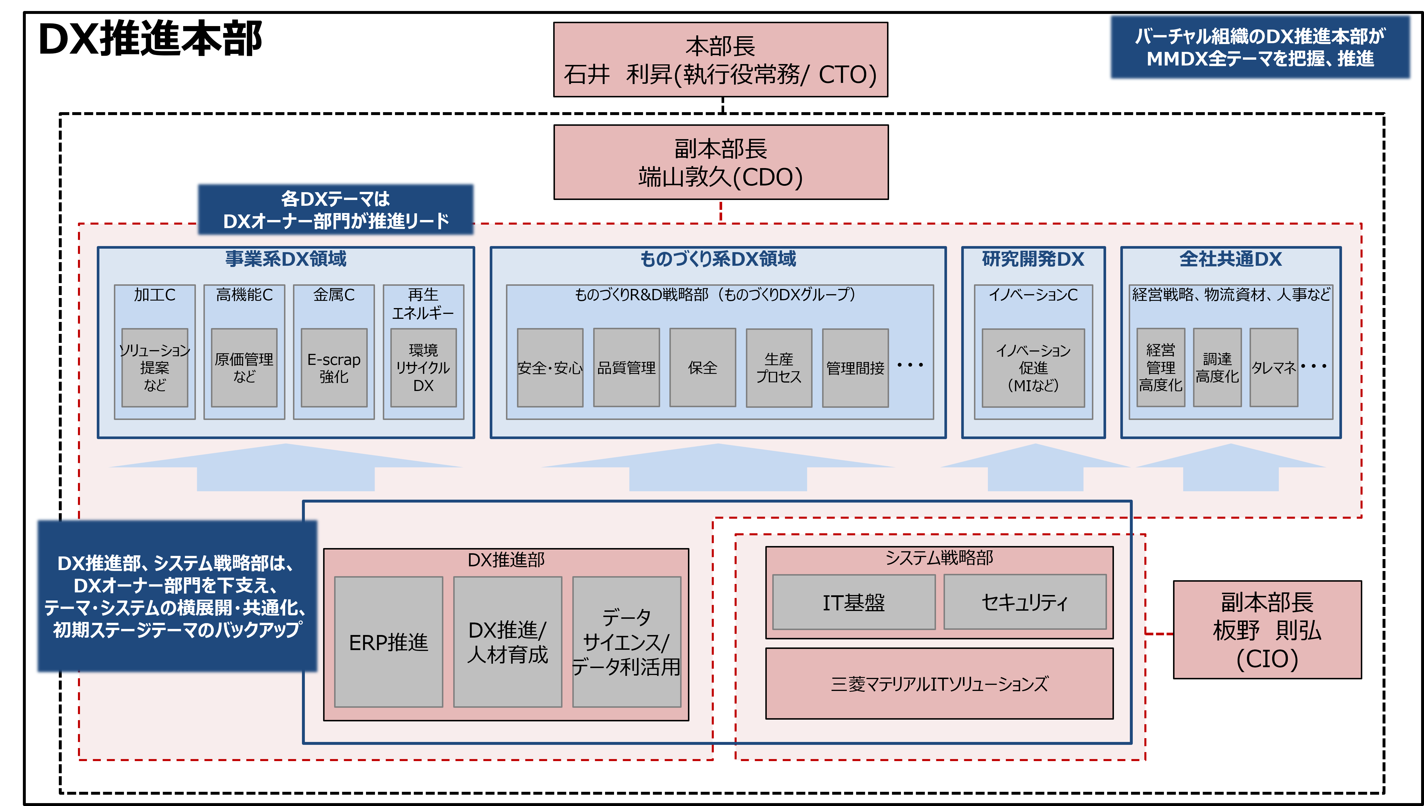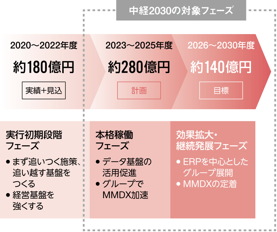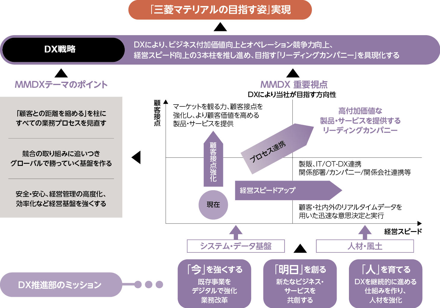 当社グループは、グローバルで勝ち抜くための基盤づくりとしてDX戦略に取り組んでいます。2030年から2050年にかけての私たちの目指す姿に向けて、「今を強くする:今の事業をデジタルで強化する」「明日を創る:新たなビジネス・サービスを事業と共創する」「人を育てる:改革を継続的に進めるための仕組みと人材を強化する」をミッションとしたDX推進部を中心に改革に取り組んでいます。DX推進の3本柱であるビジネス付加価値、オペレーション競争力、経営スピードの向上を具現化するため、「顧客接点強化」「プロセス連携の強化」「経営スピードアップ」というDXの重要視点、さらに、これらの基盤となる「システム・データ基盤の整備」と「人材育成・風土醸成」に照らして、優先的に取り組むべきテーマを選定し、事業部門とIT/デジタル担当部署が一体となった活動を展開しています。当社グループでは、これらをスピーディに遂行することで、社会の変化、環境の変化、そして自らの変革に対応するリアルタイム経営を目指していきます。この取り組みを、2020年度より当社グループのDX「MMDX」と名付け、開始から2年以上が経過した2022年度より「MMDX2.0」として新たなフェーズへとシフトしています。