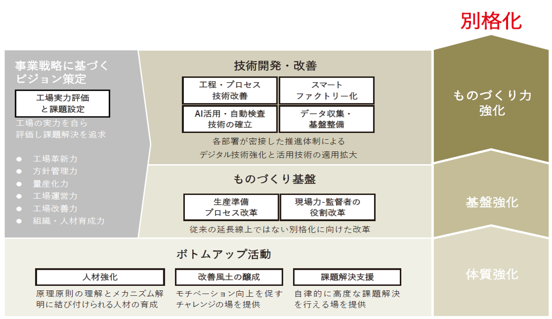 「ものづくり力別格化」の実現に向けた取り組みにより、中長期の事業成長につながる事業戦略に基づいた工場ビジョンを実現し、生産プロセス高度化のため、デジタル技術の活用による問題把握力の向上や仕事のやり方変革による本質改善力の向上を実現します。