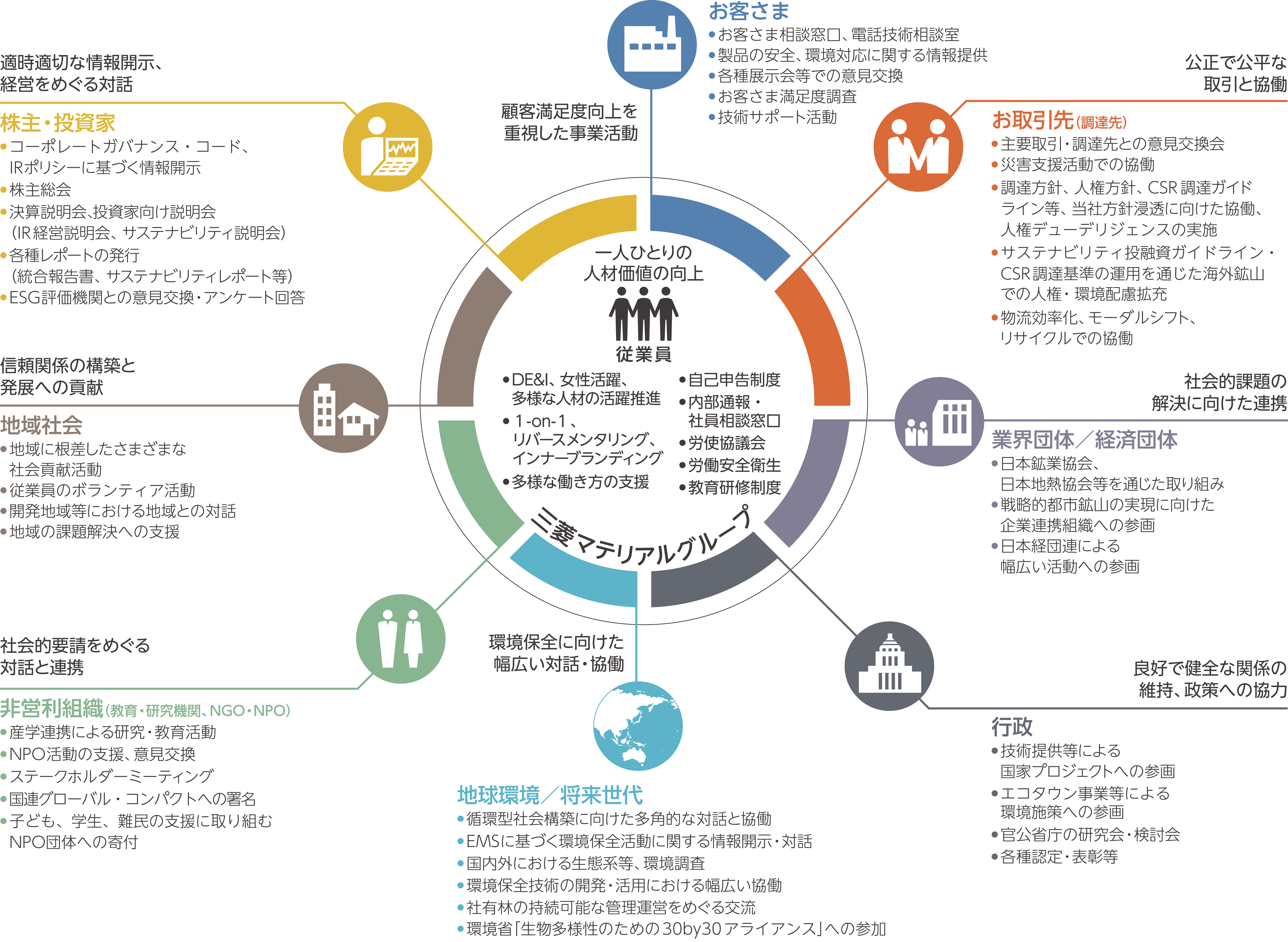 また、機関投資家・証券アナリストの皆さまとは、個別ミーティングおよび社長・CFO・社外取締役とのスモールミーティング等を通じて、活発な意見交換を行いました。一方、個人投資家の皆さまとは、個人投資家説明会への参加や株主通信「まてりある通信」の発行およびWEBサイトへの掲載を通じてコミュニケーションを図りました。